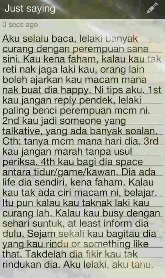 Walaupun seharian kita busy atleast try curi masa untuk dia. Sejam sekali bagitau dia yang kita rindu dia ke apa ke. Atleast tadak lah dia fikir yang kita langsung tak fikir pasal dia. Huhuhu... Lelaki ni ego, memang lah nampak macam tak kisah tapi dalaman siapa tau. kan?